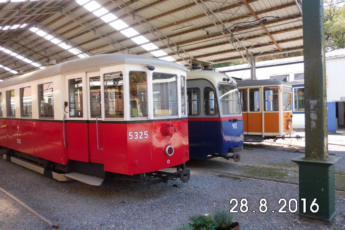 Bild 9: Bereit zur Abfahrt in gleicher Fahrtrichtung zur Kehrschleife stehen neben dem Maschinenhaus (rechts) der gelbe Berliner Tatra Zug, gefolgt von einer Tram aus München in blau/weiß. Beide werden der Wiener Tram 2625 aus Bild 8 folgen. Zwischen den Trams und der Ziegelsteinwand geht der Blick auf die weiße Giebelwand der ehemaligen Schmiede bzw. des Sozialgebäudes.