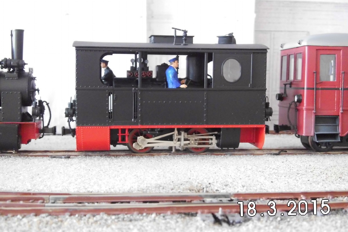 Bild 3: Lange vor dieser Aufnahme war der Papierdruck des 0e-Payerbachers als erstes fertig. Die Größe des Tws hat mich beeindruckt (Zeichng. aus Schmalspur 2-2004). Die Fertigstellung des Modelles wird inzwischen auf Seite 13 separat beschrieben. Im Hintergrund zeigt sich die Vorderfront des Badenweiler Bahnhofs, ausgedruckt in 1:45.