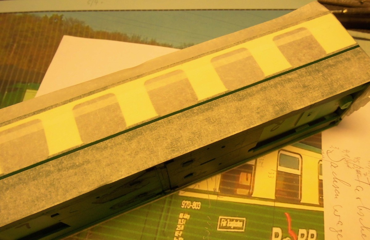 Als letzten Farbauftrag werden nach dem vollflächigen Abkleben der Außen-und Stirnwände (siehe Bild 11) der Innenraum anthrazit und der Wagenboden von Außen seidenmatt schwarz gespritzt.
